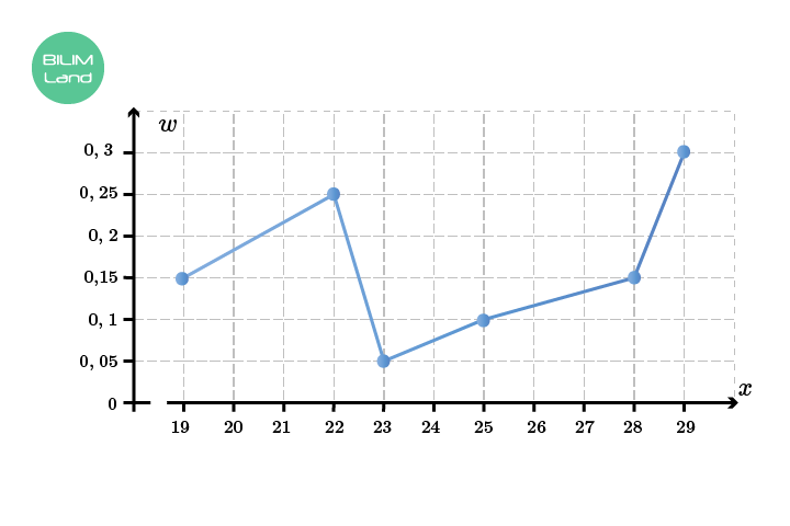 Салыстырмалы жиіліктің алқабын салу үшін координаттары (19; 0,15), (22; 0,25), (23; 0,05), (25; 0,1), (28; 0,15), (29; 0,3) болатын нүктелерді белгілеп, оларды біртіндеп кесінділермен қос.