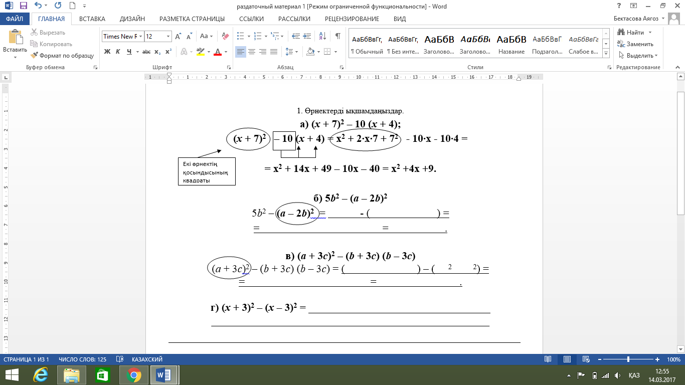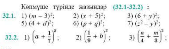 Тапсырма 1. Екі мүшенің квадратын көпмүше түрінде көрсетіңдер. Тапсырманы орындау барысында оқушылар ережені қайталайды: а)