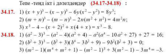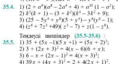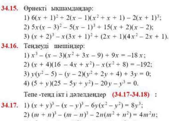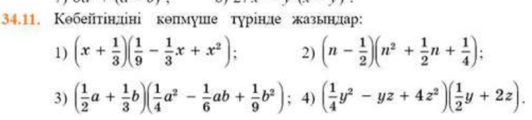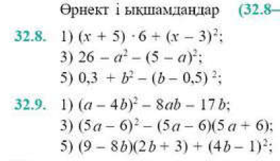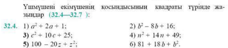 Жаңа сабақ. a + b қосындысының квадратын тап. Ол үшін (a + b)2 өрнегін (a + b)(a + b) түріне келтіріп, көбейтуді орында. (a + b)2 = (a + b)(a + b) = a2 + ab + ab + b2 = a2 + 2ab + b2 Демек: (a + b)2 = a2 + 2ab + b2. ⠀ (a + b)2 = a2 + 2ab + b2 формуласы екі өрнектің қосындысының квадратының формуласы деп аталады «екі өрнектің қосындысының квадраты бірінші өрнектің квадраты мен екі еселенген бірінші өрнек пен екінші өрнектің көбейтіндісі және екінші өрнектің квадратының қосындысына тең» деп оқылады. ⠀ Енді a – b айырмасының квадратын тап. Ол үшін (a – b)2 өрнегін (a – b)(a – b) түріне келтіріп, көбейтуді орында. (a – b)2 = (a – b)(a – b) = a2 – ab – ab + b2 = a2 – 2ab + b2 Демек: (a – b)2 = a2 – 2ab + b2. ⠀ (a – b)2 = a2 – 2ab + b2 формуласы екі өрнектің айырмасының квадратының формуласы деп аталадыдурыстап карасанызбулмеруерттинжумыстары және «екі өрнектің айырмасының квадраты бірінші өрнектің квадраты минус екі еселенген бірінші өрнек пен екінші өрнектің көбейтіндісі плюс екінші өрнектің квадратына тең» деп оқылады. ⠀ 1-мысал. Көпмүше түрінде жаз: (2m + 3n)2. Шешуі. Қосынды квадратының формуласын қолданып берілген өрнекті түрлендір: (2m + 3n)2 = (2m)2 + 2 ⋅ 2m ⋅ 3n + (3n)2 = 4m2 + 12mn + 9n2. ⠀ 2-мысал. Көпмүше түрінде жаз: (–x – 4y)2. Шешуі. Айырма квадратының формуласын қолданып берілген өрнекті түрлендір: (–x – 4y)2 = (–x)2 – 2 ⋅ (–x) ⋅ 4y + (4y)2 = x2 + 8xy + 16y2. ⠀ 3-мысал. Үшмүшені екімүшенің квадраты түрінде жаз: c2 + 18c + 81. Шешуі. Алдымен берілген үшмүшені келесі түрде жаз: c2 + 18c + 81 = c2 + 2 ∙ c ∙ 9 + 92. Енді екі өрнектің қосындысының квадратының формуласын пайдалан: c2 + 2 ∙ c ∙ 9 + 92 = (c + 9)2. Жауабы: (c + 9)2.⠀ 4-мысал. (7k2p + 8p2k)2 өрнегін көпмүшеге түрлендір. Шешуі. Қосынды квадратының формуласын пайдалан: (7k2p + 8p2k)2 = (7k2p)2 + 2 ∙ 7k2p ∙ 8p2k + (8p2k)2 = 49k4p2 + 112k3p3 + 64p4k2. ⠀ 5-мысал. a2b2 + 2ab3 + b4 өрнегінің мәнін тап, мұндағы a = 2, b = 8. Ескерту: жауапты стандарт түрде жаз. Шешуі. Алдымен ортақ көбейткішті жақша алдына шығарып, екі өрнектің қосындысының квадратының формуласын қолдан: a2b2 + 2ab3 + b4 = b2 (a2 + 2ab + b2) = b2 (a + b)2. Енді a = 2, b = 8 болғандағы соңғы өрнектің мәнін тап: b2 (a + b)2 = 82 ∙ (2 + 8)2 = 64 ∙ 102 = 64 ∙ 100 = 6400. Жауабы: 6,4 ∙ 103. |