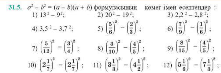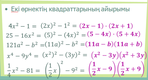 -екі өрнектің квадраттарының айырмасының формуласын білу -екі өрнектің квадраттарының айырмасы формуласын есеп шығаруда қолдану |