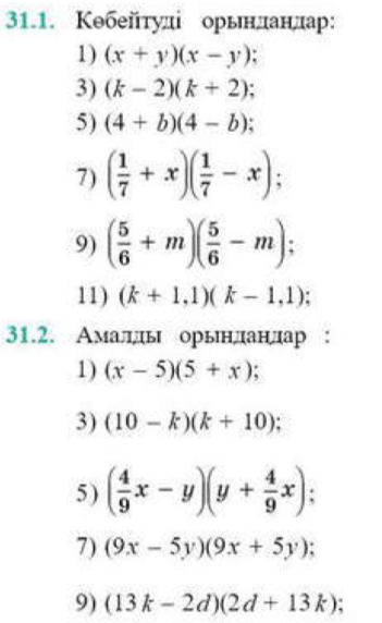 a – b айырмасын a + b қосындысына көбейт: (a – b)(a + b) = a2 + ab – ab + b2 = a2 – b2 немесе a2 – b2 = (a – b)(a + b). a2 – b2 = (a – b)(a + b) теңдігі екі өрнектің квадраттары айырмасының формуласы деп аталады және «екі өрнектің квадраттарының айырмасы олардың айырмасы мен қосындысының көбейтіндісіне тең» деп оқылады. 1-мысал. Көбейтуді орында: a) (5 – 3b)(5 + 3b) = 52 – (3b)2 = 25 – 9b2. b) (7 + 4c)(7 – 4c) = 72 – (4c)2 = 49 – 16c2. 2-мысал. Көбейткіштерге жікте: a) 81 – n2 = 92 – n2 = (9 – n)(9 + n). b) 100m2 – 16x2 y4 = (10m)2 – (4xy2)2 = (10m – 4xy2)(10m + 4xy2 ). 3-мысал. Теңдеуді шеш: x2 – 100 = 0. Шешуі. Алдымен теңдеудің сол жағын көбейткіштерге жікте: x2 – 100 = x2 – 102 = (x – 10)(x + 10). Кейін (x – 10)(x + 10) = 0 теңдеуін шеш. Көбейткіштердің бірі нөлге тең болғанда ғана көбейтіндінің мәні нөлге тең болады: x – 10 = 0 немесе x + 10 = 0, осыдан x = 10 немесе x = –10. Теңдеудің екі шешімі бар: 10 және –10. Жауабы: –10 және 10.