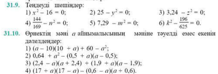 Жаңа сабақ. Видеотүсіндіру. a – b айырмасын a + b қосындысына көбейт: (a – b)(a + b) = a2 + ab – ab + b2 = a2 – b2 немесе a2 – b2 = (a – b)(a + b). a2 – b2 = (a – b)(a + b) теңдігі екі өрнектің квадраттары айырмасының формуласы деп аталады және «екі өрнектің квадраттарының айырмасы олардың айырмасы мен қосындысының көбейтіндісіне тең» деп оқылады. 1-мысал. Көбейтуді орында: a) (5 – 3b)(5 + 3b) = 52 – (3b)2 = 25 – 9b2. b) (7 + 4c)(7 – 4c) = 72 – (4c)2 = 49 – 16c2. 2-мысал. Көбейткіштерге жікте: a) 81 – n2 = 92 – n2 = (9 – n)(9 + n). b) 100m2 – 16x2 y4 = (10m)2 – (4xy2)2 = (10m – 4xy2)(10m + 4xy2 ). 3-мысал. Теңдеуді шеш: x2 – 100 = 0. Шешуі. Алдымен теңдеудің сол жағын көбейткіштерге жікте: x2 – 100 = x2 – 102 = (x – 10)(x + 10). Кейін (x – 10)(x + 10) = 0 теңдеуін шеш. Көбейткіштердің бірі нөлге тең болғанда ғана көбейтіндінің мәні нөлге тең болады: x – 10 = 0 немесе x + 10 = 0, осыдан x = 10 немесе x = –10. Теңдеудің екі шешімі бар: 10 және –10. Жауабы: –10 және 10.