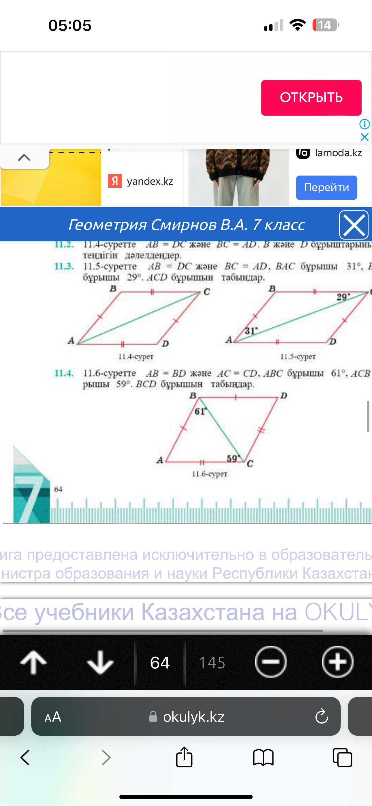 №11.4 11.6 суретте AB=BD, AC=CD, ABC бұрышы 610, ACB бұрышы 590. BCDбұрышын табыңдар