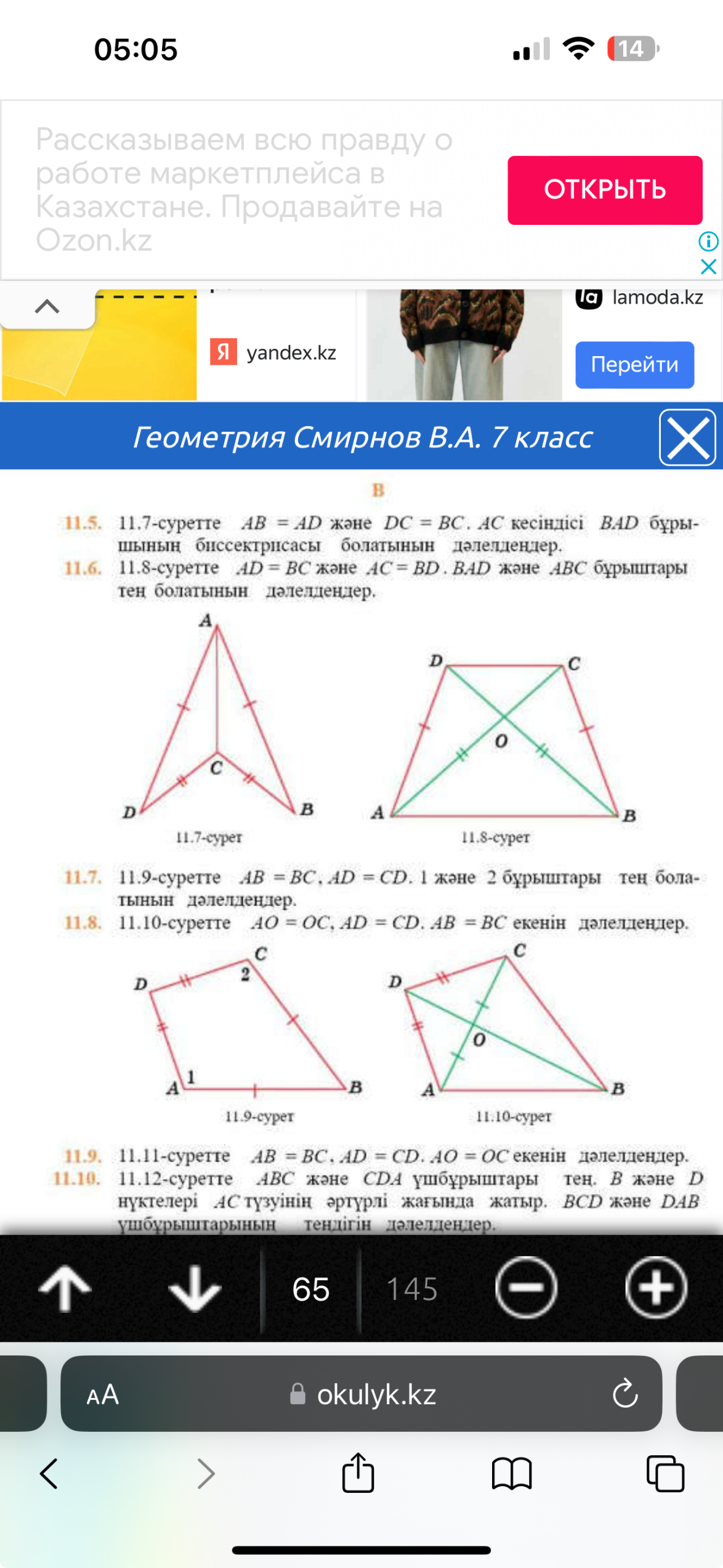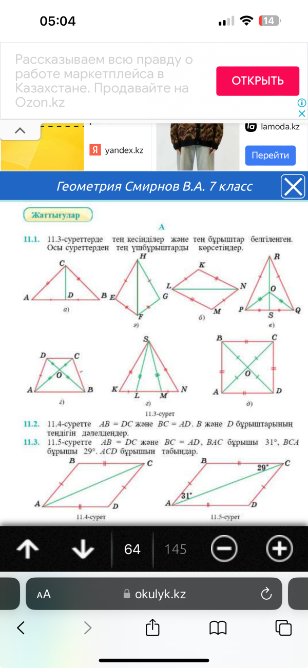 Берілген тапсырмаларды орынайды №11.2 11.4 суретте AB=DC,және BC=AD, Bжәне D бұрыштарының теңдігін дәлелде.