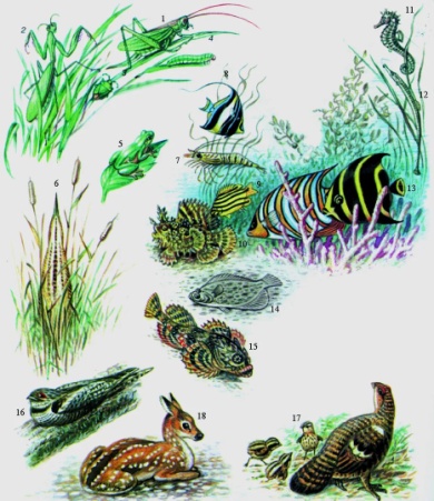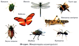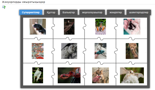 1.Кептер, 2.ит, 3.құмырсқа, 4.жауын құрты, 5.кесіртке, 6. жылан, 7.көбелек, 8.Маса, 9.маймыл, 10.өрмекші,11. балық, 13.шаян, 14.теңізжұлдызы,15.қой