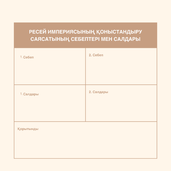 Ресей империясының қоныстандыру саясатының себептері мен салдарын талдайды. Жұбымен жұмыстанады.