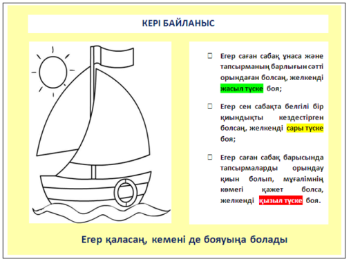 Осындай тәсілмен оқушылардан кері байланыс ала отырып мақсатқа қаншалықты жеткендігін анықтауға болады. |