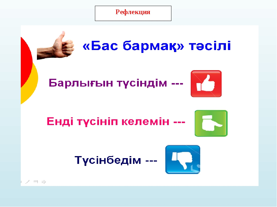 Сабақ соңында оқушылар рефлекция жүргізеді: - не білді, нені үйренді - не түсініксіз болды -немен жұмыстану қажет Сабақтың қорытындысы |