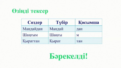 74-жаттығу Берілген сөздерге жұрнақ пен жалғауды қатарынан жалғап жаз. Тазалықшыға, білімге, дойбышының, жаңалықтар. Ережемен жұмыс Түбір сөзге жұрнақ та,жалғау да жалғана береді. Алдымен жұрнақ,содан соң жалғау жалғанады. Ұшқышпен..... ФС тапсырмасы Шығармашылық тапсырма 75-жаттығу «Деніңнің сау болуы өзіңе байланысты» тақырыбындағы пікірталасқа қатыс. Ол ұшін төмендегі талаптарды басшылыққа ал. 1.Өз пікіріңе нақты дәлел келтір. 2.Пікірінің дұрыстығына басқаларды сендіре біл. Үй тапсырмасы 73-жаттығу Өлеңді көшіріп жаз. Қарамен жазылған сөздерді сөз құрамына қарай талда. ҚЖ: