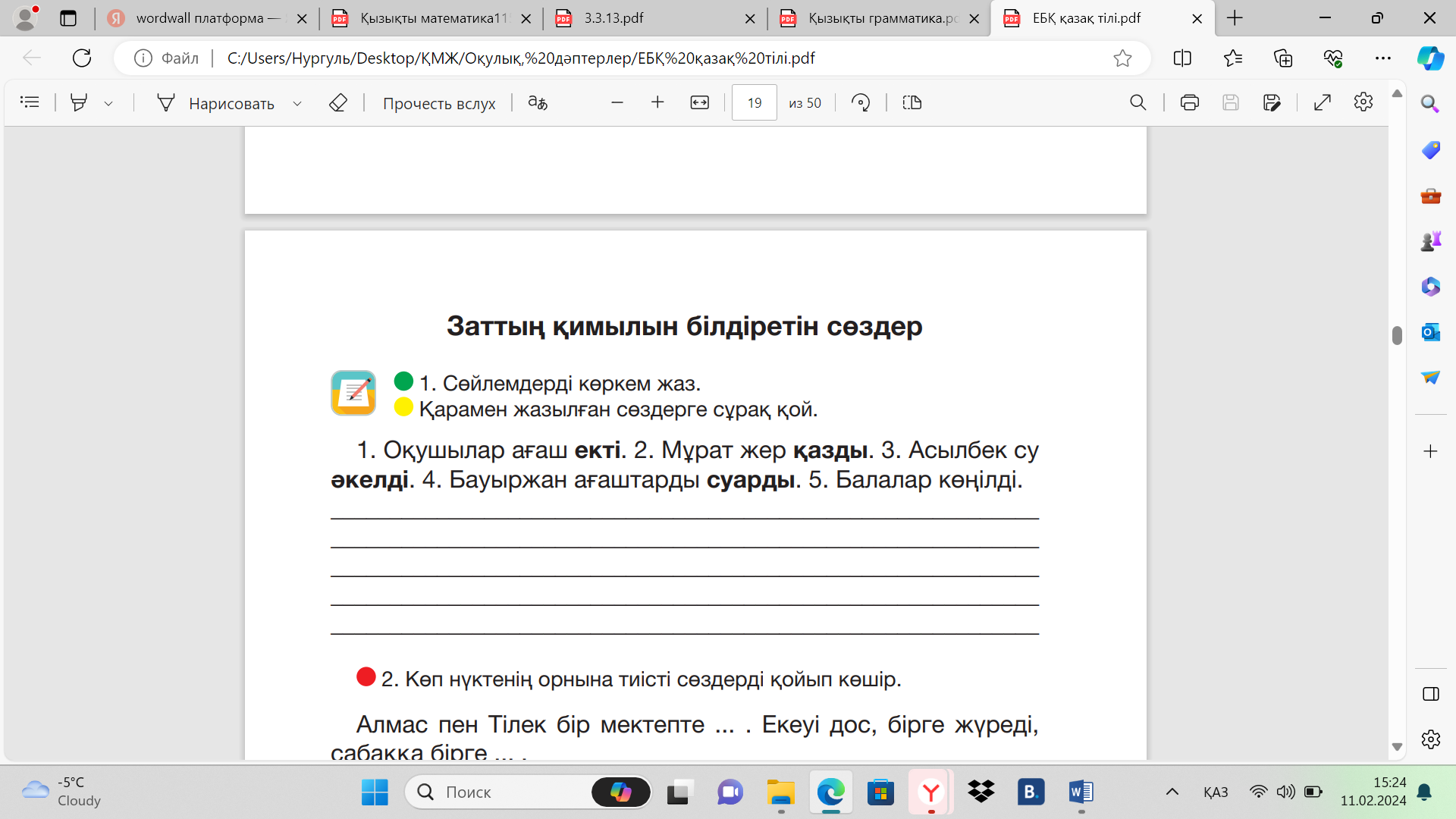 Туынды етістіктердің ішінен өзі қалаған үш-төрт сөзбен сөйлем құрап жазады.