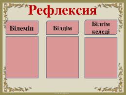 Жеке жұмыс: - бүгінгі сабақта мен....түсіндім, ...білдім, ....көзімді жеткіздім. - бүгін сабақта қуантқаны..... - мен өзімді.....үшін мақтар едім. - маған ерекше ұнағаны..... - сабақтан соң маған........келді - бүгін маған..........сәті түсті. - қызықты болғаны..... - ......қиындық тудырды. - менің түсінгенім..... - енді мен......аламын. |