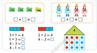 Дескриптор: Заттардың санын анықтайды, сұрақ қояды,жауап береді-жарайсың! Заттардың санын анықтауда, сұрақ қоюда, жауап беруде көмек қажет етеді -жақсы! Заттардың санын анықтауда, сұрақ қоюда,жауап беруде қиналады -талпын! 4 санының құрамын айтады, мысалдар құрастырады, 4 цифрын дұрыс жазады -жарайсың!