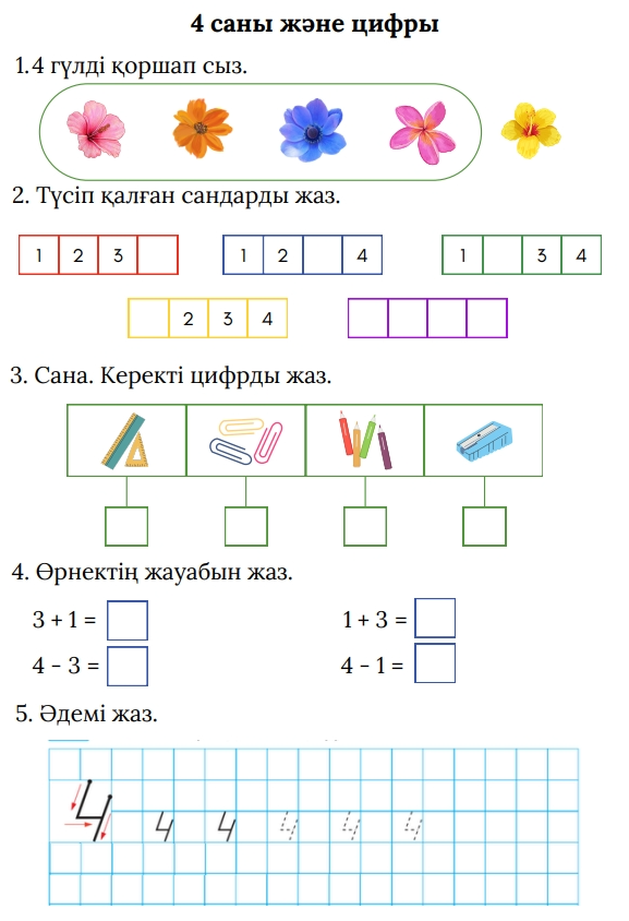 4 санының құрамын айтуда, мысалдар құрастыруда, 4 цифрын жазуда қиналады -талпын! |