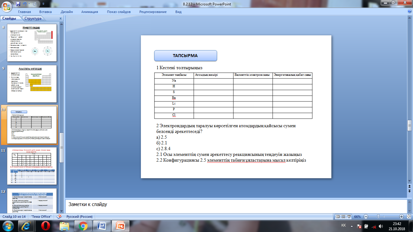Оқушыларға тапсырмалар таратылады, олар периодтық кестені қолдана отырып, сұрақтарға дұрыс жауап бере алулары қажет.