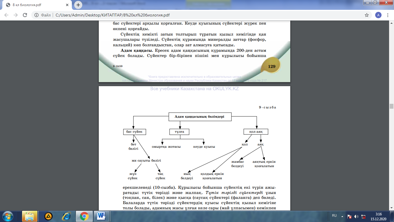 Адам қаңқасының құрлысын тұжырымдайды, қайда орналасқандығын айта алады, тірек – қимыл жүйесінің қызметтерін сипаттайды; |