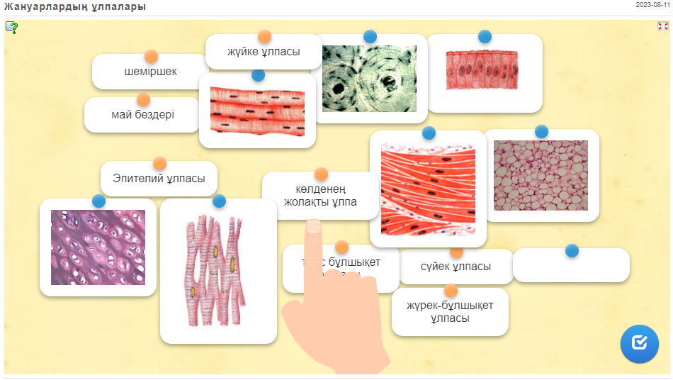 Оқушылар ұстазымен амандасады. Сынып тәртібін сақтайды, мотивациялық сөздер айтады. 1топ- Дәнекер 2топ- Жүйке 3топ-Бұлшықет Оқушылар тақтада берілген сандарды кубик лактыру арқылы тадайды Құпия сұраққа жауап береді Мағынаны түсіну үшін оқушылар топта бірлеседі -Бірлесіп берілген тапсырманы орындайды -Сұрақтарға жауап береді - Осы ресурстардың көмегімен оқушылар өсімдік жануар ұлпаларының түрлерімен танысып, зертханалық жұмысты орындайды. Тірі үлгі, сурет, сызбалардан ұлпа түрінің ерекшеліктерін анықтап, суретін салып, қысқаша сипаттамалар береді. Кейбір ұлпалардың суреттері, тірі үлгісі немесе микропрепараты болмаса оқушыларға видеоматериалдарды қолдану ұсынылады. Видеолардың көмегімен зертханалық жұмыстың кейбір бөлігін орындауға болады..