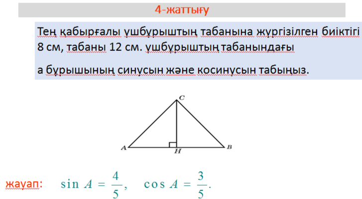 Бағалау баллы -Сүйір бұрышының синусын табады;1балл -Сүйір бұрышының косинусын табады;1балл -Сүйір бұрышының тангенсін табады;1балл Бағалау баллы -А бұрышының синусын табады 1балл -А бұрышының косинусын табады 1балл Бағалау баллы -тікбұрышты үшбұрыштың гипотенузасын табады 1балл -А бұрышының тангенсін табады 1балл Бағалау баллы Пифагор теоремасын қолданады1бал -биіктігін табады 1балл |