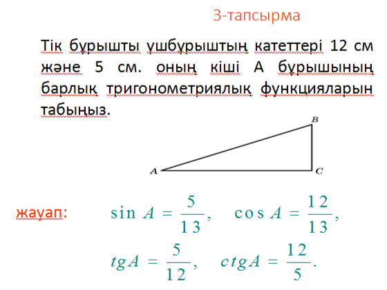 Сәлемдесу Оқушыларды түгендеу Әділдік пен жауапкершілік айы.Сөзіңді түзе,әдетіңе айналады.Әділ сөйлеп,адал жүр. Сұрақтар:1.Тікбұрышты үшбұрыштың сүйір бұрышының синусы дегеніміз? 2.Тікбұрышты үшбұрыштың сүйір бұрышының косинусы дегеніміз? 3.Тікбұрышты үшбұрыштың сүйір бұрышының тангенсі дегеніміз 4.Тікбұрышты үшбұрыштың сүйір бұрышының котангенсі дегеніміз? 5.Пифагор теоремасы? |