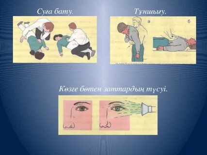 Белгілері: естен тану, тыныс алу мен тамыр соғысының жоғалуы, терісі көгілдір-сұр. Сенің әрекеттерің: жасанды тыныс алдыру және жүректі жанамалай уқалап, сылау.