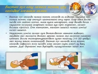 Есіңді болсын! Сүт ішуге болмайды! - 1 литр суытылған қайнаған суға 1 шай қасық тұз және 4 шай қасық қант қос немесе дайын регидрон таблеткасын іш. - Аспирин және ауруды басатын дәрі-дәрмек қабылдама. - Егер бір тәуліктен кейін жеңілдікті сезінбесең, дәрігерге қарал.