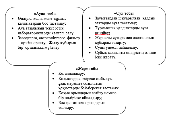 ЕББ оқушыға суреттер/иллюстрациялар ұсынылады; суретпен жұмыс. Мұғалім: Табиғаттың ластануына өнеркәсіптің дамуы әсерін тигізеді. Өнеркәсіптің қоршаған ортаға әсері Слайдты көрсете отырып оқушыларды ойларын қорытуға жетелейді. а) Топыраққа әсері: ластанады, құнарлылығы нашарлайды. ә) Суға әсері: мұнай өнімдерімен, радиоактивті заттармен ластанады. б) Ауаға әсері: қышқылды жаңбырлар жауады, жер бетінің температурасы өзгереді, жанауарлар мен өсімдіктер өледі. в) Адамға әсері: ағза әлсірейді, бой ақырын өседі, ауруға қарсы тұру қабілеті төмендейді. Қазақстандағы ең көп ластанатын қалалар – Ленингор, Зырян 6. Тәжірибе. Судың ластануы. – Ыдысқа су құю, судың бетіне автол майын құю; – Нәтижесін болжау (балалардың пікірін тыңдау). Бейнебаяндағы көрсетіліммен және слайдтағы мәліметтермен салыстыра отырып талдау жасау. 7. Қоқыс жинайтын орын тұрмыстық қалдықтар тасталатын жер Ойын: «Қоқысты сұрыптау». Мақсаты: Қоқыс жәшікке тастауға болмайтын заттарды сұрыптау. 8. «Қалдықтардың екінші өмірлері ...» Жердің ластануын қалай азайтуға болады? Қалдық заттардан қажетті тұрмыстық бұйымдар жасауға болатынына көз жеткізу. Оқушылар қажетсіз заттардан (СД диск, пакеттер, баклажкалар, қағаздар) жаңа бұйымдар жасайды. Жасаған бұйымдарын қорғайды.