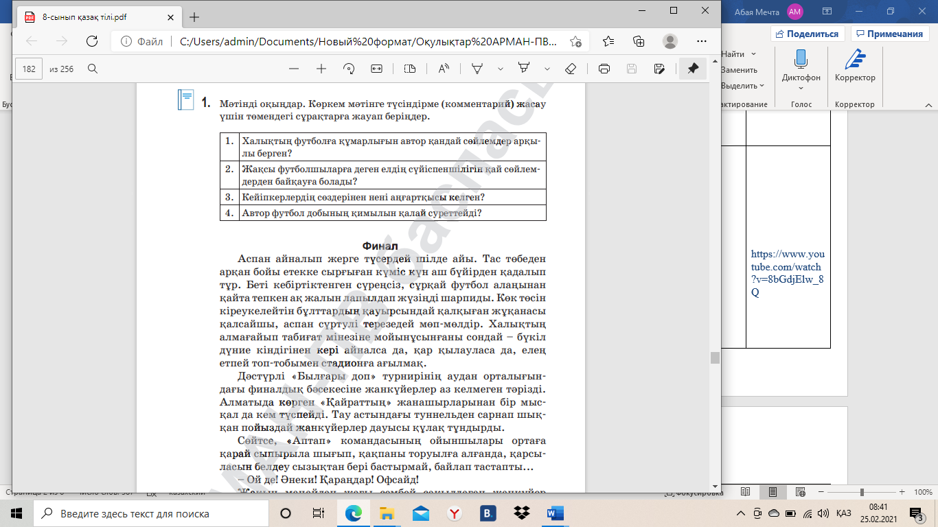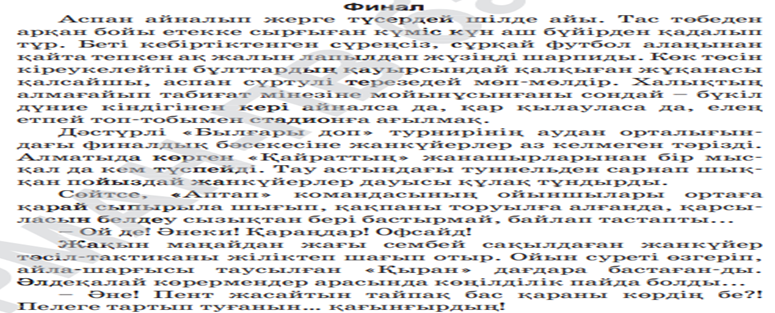 Оқушылар берілген мәтінмен танысады, мәтін бойынша тапсырма түрлерін орындайды. «Қазақстанда футбол ойындары дамыған ба?»деген тақырыпта жұптарыңмен диалог құрыңдар.Бір-біріңе екі сұрақтан қойып, өз ойларыңды жүйелі жеткізіңдер. |