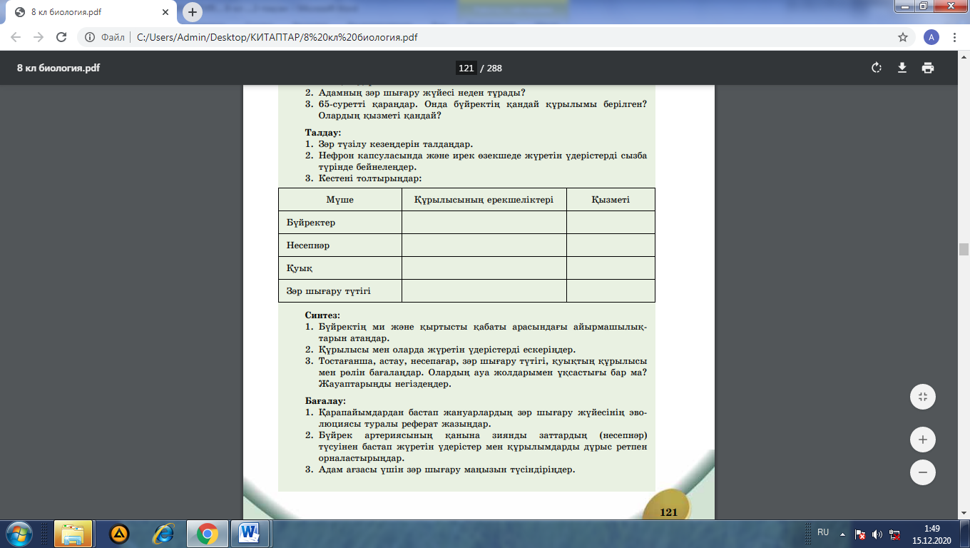 Бағалау критерийі: -зәр шығару мүшелерінің құрылыс ерекшеліктерін салыстырады және қызметін зерделейді; (Әр оқушы өз ойымен бөліседі. Бір-бірінің пікірін толықтырып, пікір алмасады, берілген тапсырманы бағалау критерийі бойынша орындайды;) |