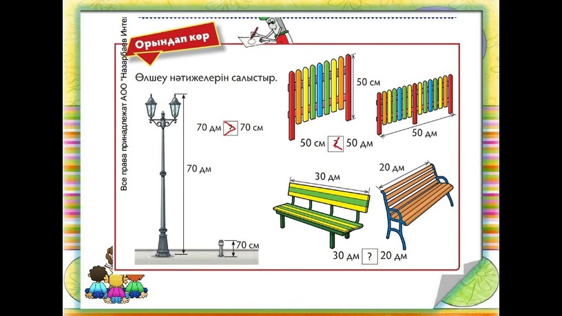 1.1.3.2 ** Өлшем бірліктерін пайдаланып, шамаларды өлшеу: см, дм/кг/л. 1.1.3.3 ** Ұзындық: см, дм/ масса: кг/ көлем (сыйымдылық): л/ уақыт: с. шамасы мәндерін салыстыру және шама мәндерін қосу мен алу әрекеттерін орындау. 1.1.3.4 Ұзындықты өлшеу бірлігін: см, дм олардың арасындағы арақатынастар негізінде түрлендіру.