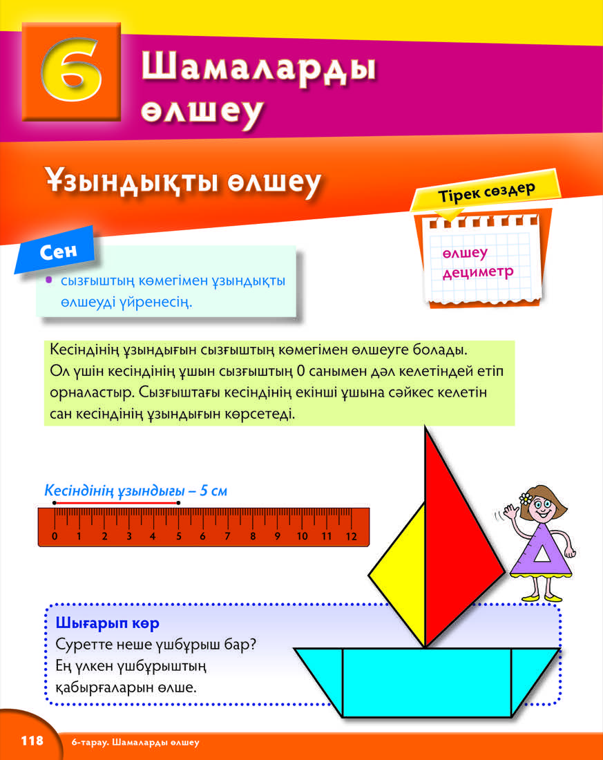 Стандартты өлшем бірліктерін пайдалану Сантиметр (Ұ,Қ) Оқушы естіген өлшем бірліктері және оларды қалай қолдануға болатыны туралы талқылау. Талқылау нәтижелеріне байланысты тәжірибеде зерттеу үшін стандартты өлшем бірліктерді енгізу, оқытуда алға жүру үшін олардың әр түрлі тәсілдерін қолдану. Ұзындықты қалай өлшейтінін талқылау. Егер оқушы сызғышты немесе лентаны қолдануды ұсынса, қандай тәсілмен өлшегендерін түсіндірсін (метрді стандартты өлшем бірлігі ретінде қолдану). Заттарды өлшеуге тапсырма беріледі және нәтижелерін түсіндіреді. Оқушы үстелінде жатқан қарындаш пен қаламсаптарының ұзындығын өлшеу. Салыстыру үшін беттестіруге болады. Содан кейін суреттегі қаламсап пен қылқаламның ұзындықтарын салыстыру (қаламсап қылқаламнан қысқарақ), қызыл қарындашты қаламсаппен салыстыру (қызыл қарындаш қаламсаптан қысқарақ). Бұл жерде оқушылар заттарды көзбен қарап салыстырады, себебі суреттегі заттарды беттестіруге келмейді. Оқушы суретте салынған заттардың ұзындығы болатынын түсінеді. Түрлі материалдан, түрлі түстен ұзындықтары әртүрлі жолақтар жасап, оқушылар олардың ұзындықтарын түрлі өлшеммен өлшейді. Өлшеуіш ретінде жіңішке қағаз жолақтар, әртүрлі ұзындықтағы таяқшалар алуға болады. Тәжірибе жұмысынан кейін оқушыларда сұрақтар туындауы мүмкін: бірдей заттарды өлшеген кезде нәтижелер барлығында бірдей болу үшін қалай өлшеу жүргізуге келісу керек? Ұзындықтың өлшеудің бірегей әдісі болу керек. Мұндай өлшем бірлігі сантиметр болып табылады. Заттардың ұзындығын сызғышпен және сантиметрлік таспамен өлшеуге болады. Сантиметрдің моделін жіңішке қағаз жолағында көрсету. Сантиметрді саусақ тың жуандығымен, дәптердегі екі тордың ұзындығымен салыстыруға болады. Содан соң оқушыларды сызғышпен таныстыру. Кесінді өлшеу үшін сызғышты қолдану ережесімен таныстыру. Оқушы кесінділердің қадамдап салынуымен таныстыру. Қаламсап пен қарындаштың ұзындықтарын өлшеу. Енді өлшем нәтижелері бірдей болды ма деп сұрау. Қорытынды жасау.
