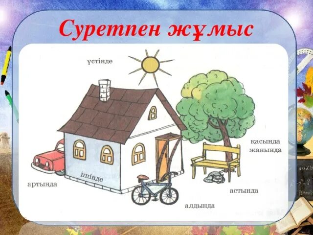 Заттардың бір-біріне қатысты орналасуы (арасында, ортасында, қарсысында, іші мен сыртында, үстінде, астында, алдында, жанында) |