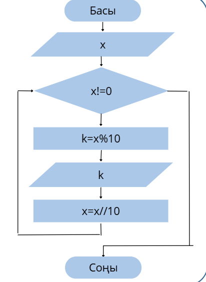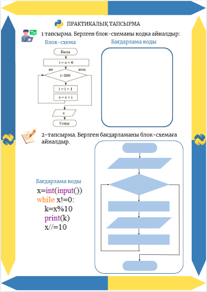 Оқушылар дәптерлерін ашып, күнді және тақырыпты жазады.. Практикалық тапсырмаларды мұғаліммен қарастырады. Практикалық тапсырма: 1 тапсырма. А)Берлген блок-схеманы кодка айналдырады. i=s=0 while i<100: i=i+1 s=s+i print(s) Б)Берлген кодты блок-схемаға айналдырады: