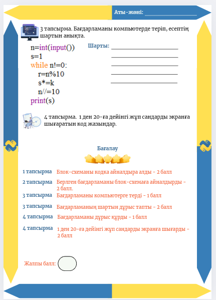 2 тапсырма. Кодты компьютерде терп, есептң шартын анықтайды: Берілген санның цифрларының көбейтіндісі. 3 тапсырма: n = 1 # Санның бастапқы мәні while n <= 20: # 1-ден 20-ға дейінгі сандарды қарастыру if n % 2 == 0: # Егер сан жұп болса print(n) # Санды шығару n = n + 1 # Санды 1-ге арттыру Практикалық тапсырманы орындауға көшеді. Тапсырмаларды аяқтайды және тексереді. |