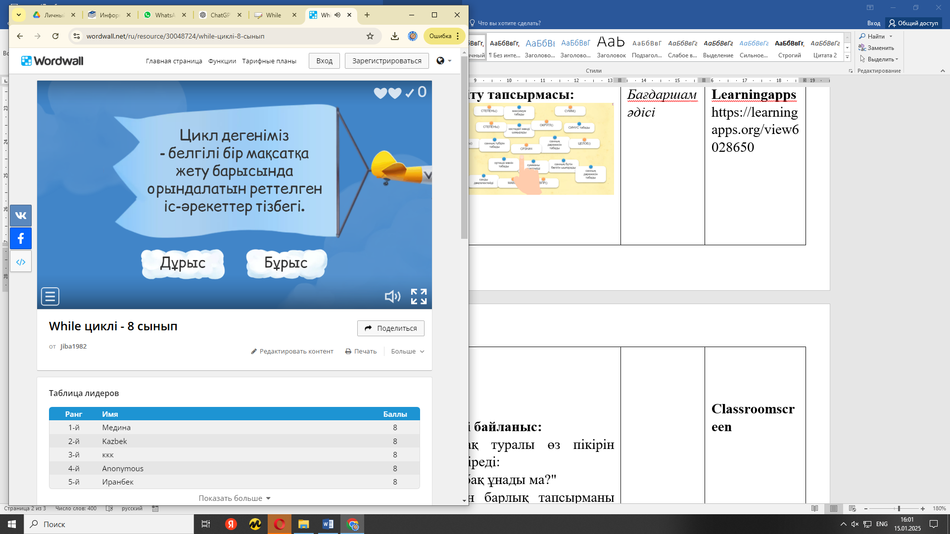 Жарайсыздар! Барлық сұрақтарға жауап бердіңіздер. Өткен тақырыпты қайталап шықтық. Бүгінгі сабақта whilе функциясын қолданып есептер шығаратын боламыз. |