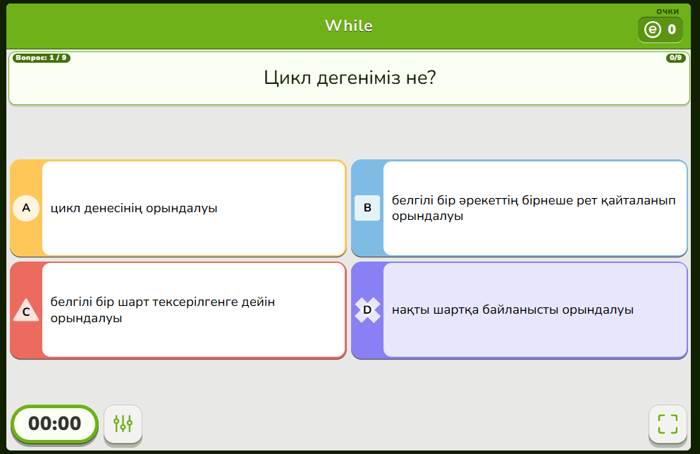 Ұйымдастыру кезеңі: Сәлеметсіздер ме, оқушылар! Бүгінгі сабағымызға дайындалып, барлығымыз орындарымызға жайғасайық. Сабақта кім бар, кім жоқ екенін түгендеп алайық. Өткен тақырыпты қайталау: Оқушылар, сіздер өткен сабақта «цикл» және «while функциясымен» таныстыңыздар. Енді барлығымыз өткен тақырыпты қайталап өтейік. Ол үшін тақтада берілген сұрақтарға жауап беріп көрейік. Сұрақтар: 1. Цикл дегеніміз не? 2. Print операторының қызметі... 3. print(4+5) ? 4. a=int(input()) a=4 print(a+2+5) 5. input операторының қызметі? 6. Код үзіндісінде while циклінің қандай шарт орындалғанша жұмыс істейтінін анықтаңыз: 7. Цикл қандай жағдайда тоқтайды? 8. While циклі дегеніміз не? 9. Python тілінде While циклінің дұрыс құрылымы қайсы?