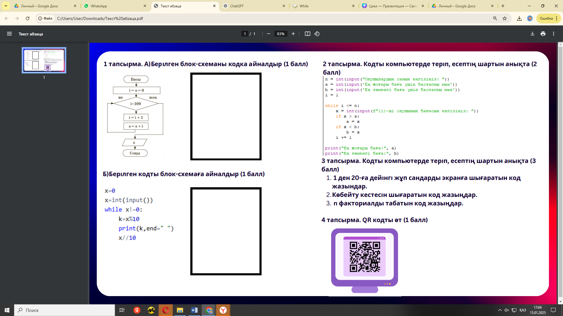 Барлығыңыз оқулықтың 87-ші бетін ашып, тақырыпты дәптерге жазып алыңыздар. Балалар, бүгін біз While функциясын қолданып, есеп шығарамыз. Алдымен, сіздерге арналған тапсырмаларды қарастырып шығайық. Практикалық тапсырма: 1 тапсырма. А)Берлген блок-схеманы кодка айналдыр