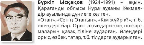 IV.Сабақты қорытындылау. 1. Бүркіт Ысқақов кім? 2.Ақынның қандай өлеңдерін білесің? 3. "Шер тарқату" сөзін қалай түсінесің? 4. Ақын өлеңнің тақырыбын неліктен "Қанатты қиял" деп атаған? 5. Қарт баласының болашағынан не күтеді? 6. Баланың мамандық таңдауына не әсер етті? (оқу мақсаты мен бағалау критерийлеріне оралу): -Бүгінгі оқу мақсаты қандай болды? -Жетістік критерийлеріне жеттік пе? Бұл сабақта қандай жаңа білім алдың Үй тапсырма . Өлеңді түсініп оқу. Айтылуы мен жазылуына байланысты кестеден қате сөзді тап.