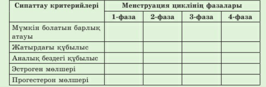 Дескриптор: Жалпы-4 балл Кесте бойынша сипаттаукритерийлері бойынша менструация циклінің фазаларын сипаттайды.2- балл Постер/класстер салу арқылы топ тақырыбын түсіндіріп ашады 2- балл Оқушыларды ынталандыру мақсатында «Мадақтау сөз» әдісі арқылы бағалайды. Қолдауды қажет ететін оқушыларға жетелеуші, бағыттаушы, түрткі сұрақтар қойып, қолдау көрсетеді |