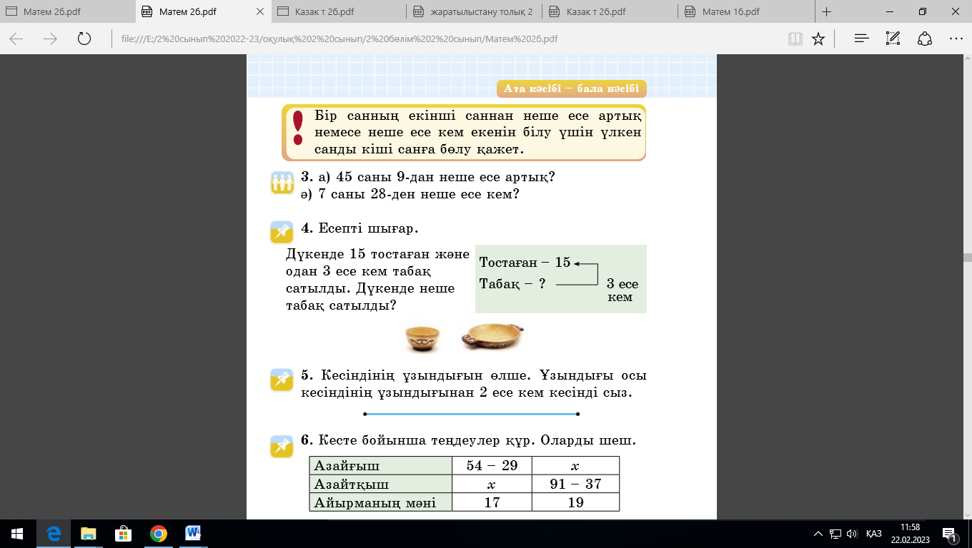 Ш.: 15:3=5 (т) Ж.: дүкенде 5 табақ сатылды. 5-тапсырма Кесіндінің ұзындығын өлше. Ұзындығы осы кесіндінің ұзындығынан 2 есе кем кесінді сыз.