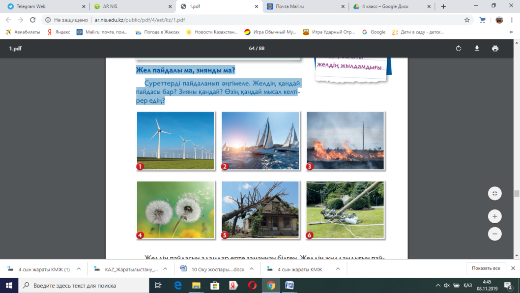 Суреттерді пайдаланып әңгімеле. Желдің қандай пайдасы бар? Зияны қандай? Өзің қандай мысал келтірер едің?