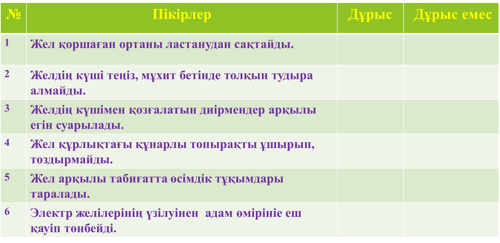 4.3.2.1адам тіршілігінің түрлі салаларында ауаны қолдану жолдарын анықтау 4.3.2.5 желдің пайдасы мен зияны туралы мысал келтіру; |