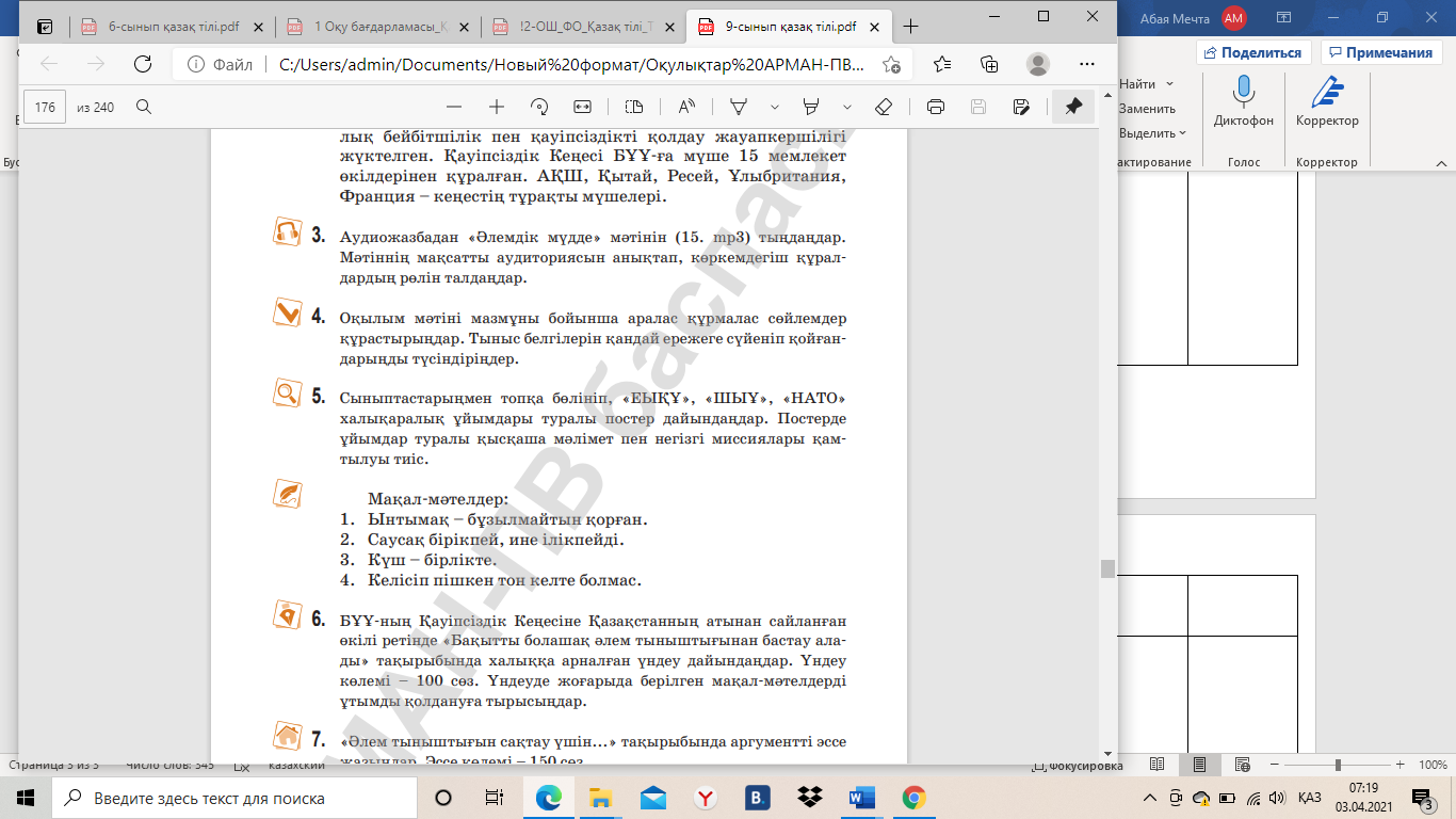 Мәтінді түсініп оқыңыз. Төменде берілген тірек сөздерді қолдана отырып, мәтінде көтерілген мәселеге оқырманның қарым-қатынасын анықтауға арналған талқылау сұрақтарын құрастырыңыз. Грамматикалық тапсырма орындайды. Халықаралық ұйымдары туралы постер дайындайды; постерде ұйымдар туралы қысқаша мәлімет пен миссияларды қамтиды; берілген мақал-мәтелдерді қолданады; тақырып бойынша ой қорытындылайды. |