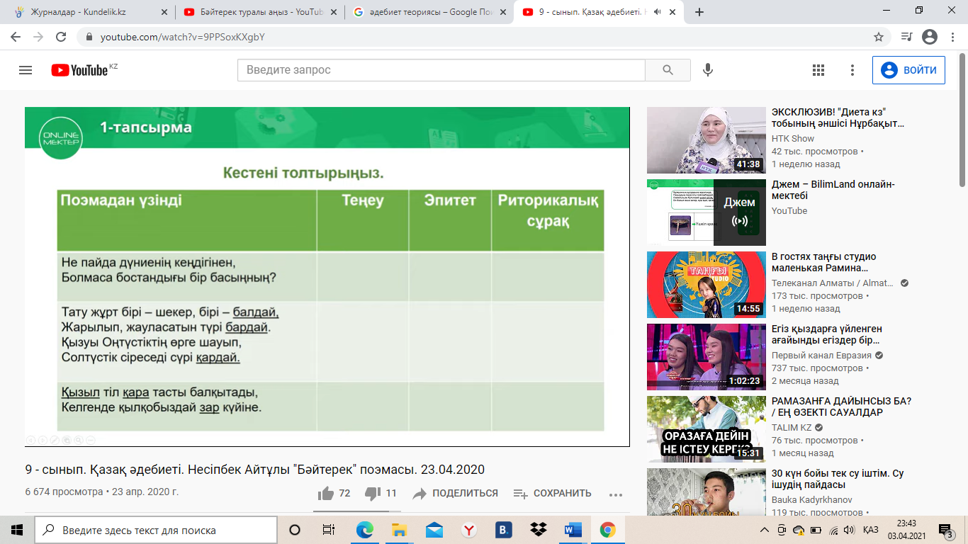 Рефлексия. Үйге тапсырма: Поэмадан үзінді жаттау |