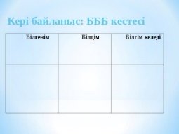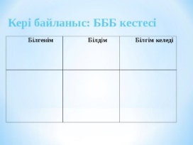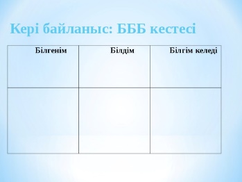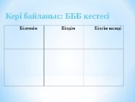 Кері байланыс: «БББ» әдісі. Мұғалім сабақты қорытындылау мақсатында оқушылардың сабаққа деген көзқарасын, кері байланысын тыңдайды. Мақсаты: Оқушы алған білімін саралай білуге дағдыланады. Тиімділігі: Тақырып бойынша оқушылардың пікірін анықтайды. Жинақталған деректердің құнды болуын қадағалайды. |
