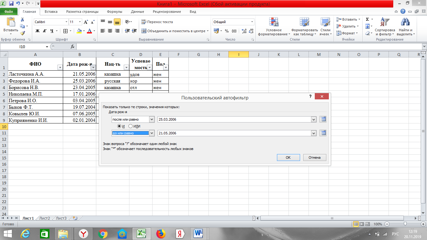 Определите количество записей в таблице после применения пользовательского фильтра к полю «Дата рождения»