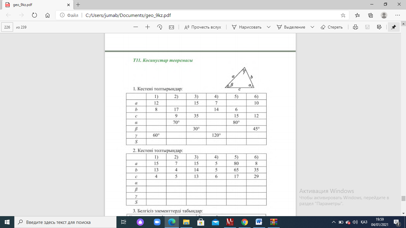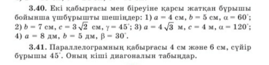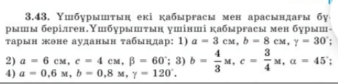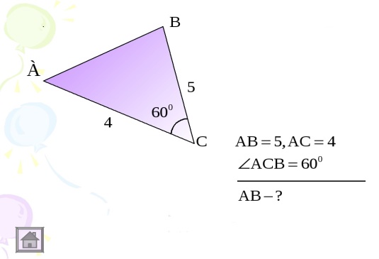 элементтерін анықтайды 2.Үшбұрыштың екі қабырғасы а мен b,ал арасындағы бұрышы-60 Еﹾгер а=8 см b=15 см болса оның үшінші қабырғасын табыңдар.