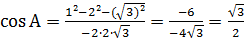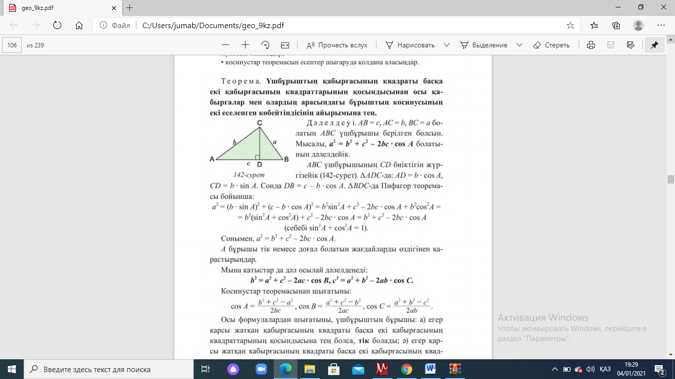 Теорема. Кез келген үшбұрыштың бір қабырғасының квадраты қалған екі қабырғасының квадраттарының қосындысынан олардың ұзындықтары мен арасындағы бұрыштың косинусының екі еселенген көбейтіндісін азайтқанға тең.