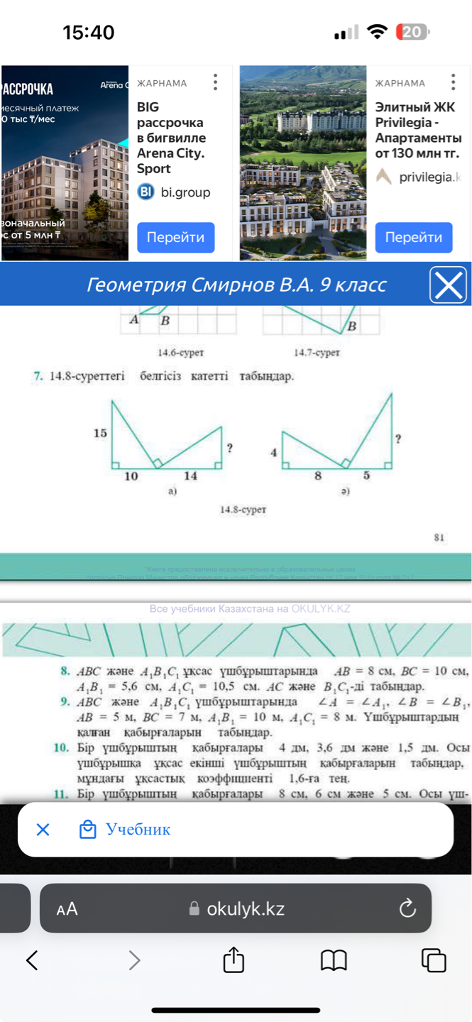 Тапсырмаларды орындау №3-80бет Егер бір тікбұрышты үшбұрышты бұрышы 40°, ал екінші тікбұ- рышты ушбұрышты бұрышы 50° болса, онда бул үшбұрыштар ұқсас бола ма? |