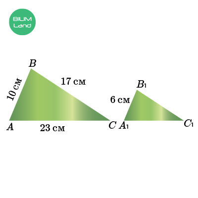 пропорционал. Үшбұрыштар ұқсастығының бірінші белгісі. Егер бір үшбұрыштың екі бұрышы екінші үшбұрыштың сәйкес екі бұрышына тең болса, онда бұл үшбұрыштар ұқсас болады. Үшбұрыштар ұқсастығының екінші белгісі. Егер бір үшбұрыштың екі қабырғасы сәйкесінше екінші ұшбұрыштың екі қабырғасына пропорционал және олардың арасындағы бұрыштары тең болса, онда бұл үшбұрыштар ұқсас болады. Үшбұрыштар ұқсастығының үшінші белгісі. Егер бір үшбұрыштың үш қабырғасы сәйкесінше екінші үшбұрыштың үш қабырғасына пропорционал болса, онда бұл үшбұрыштар ұқсас болады. Мысал. ABC және A1B1C1 үшбұрыштарында ∠A = ∠A1 және ∠B = ∠B1 болады және AB = 10 см, AC = 23 см, BC = 17 см, A1B1 = 6 см. B1C1 және A1C1 қабырғаларының ұзындықтарын тап.