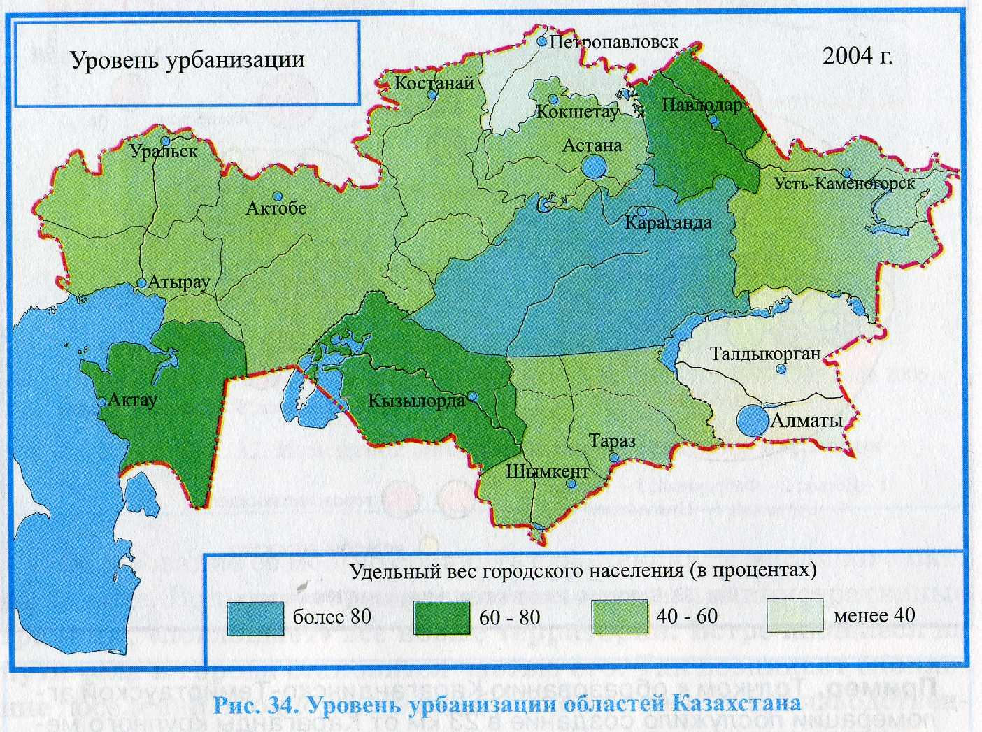 Картадан Қазақстандағы урбандалу деңгейі ең жоғары және ең төменгі облысты көрсетеді |