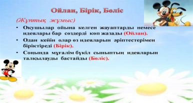 Мақсаты: оқушылар бойында идея немесе тілек білдіру, тыңдау дағдыларын дамытуға бағыттау, сондай-ақ барлық оқушыларды қатыстыру арқылы оқыту жағдайларын теңестіру.